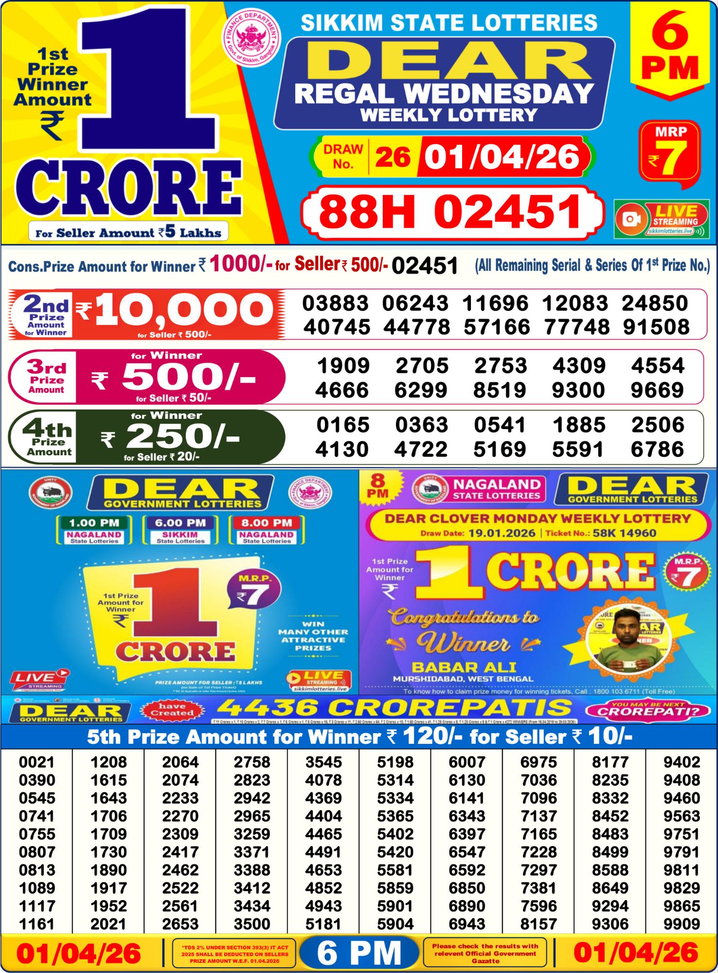 Status: Declared. 1st Prize (₹1 Crore) winning number: 88H02451#1PM88J46956.