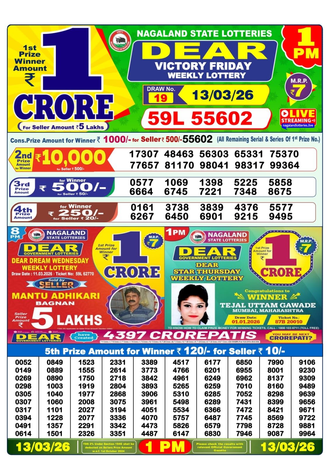 Lottery Sambad – 1PM, 6PM & 8PM Results for 13/03/2026