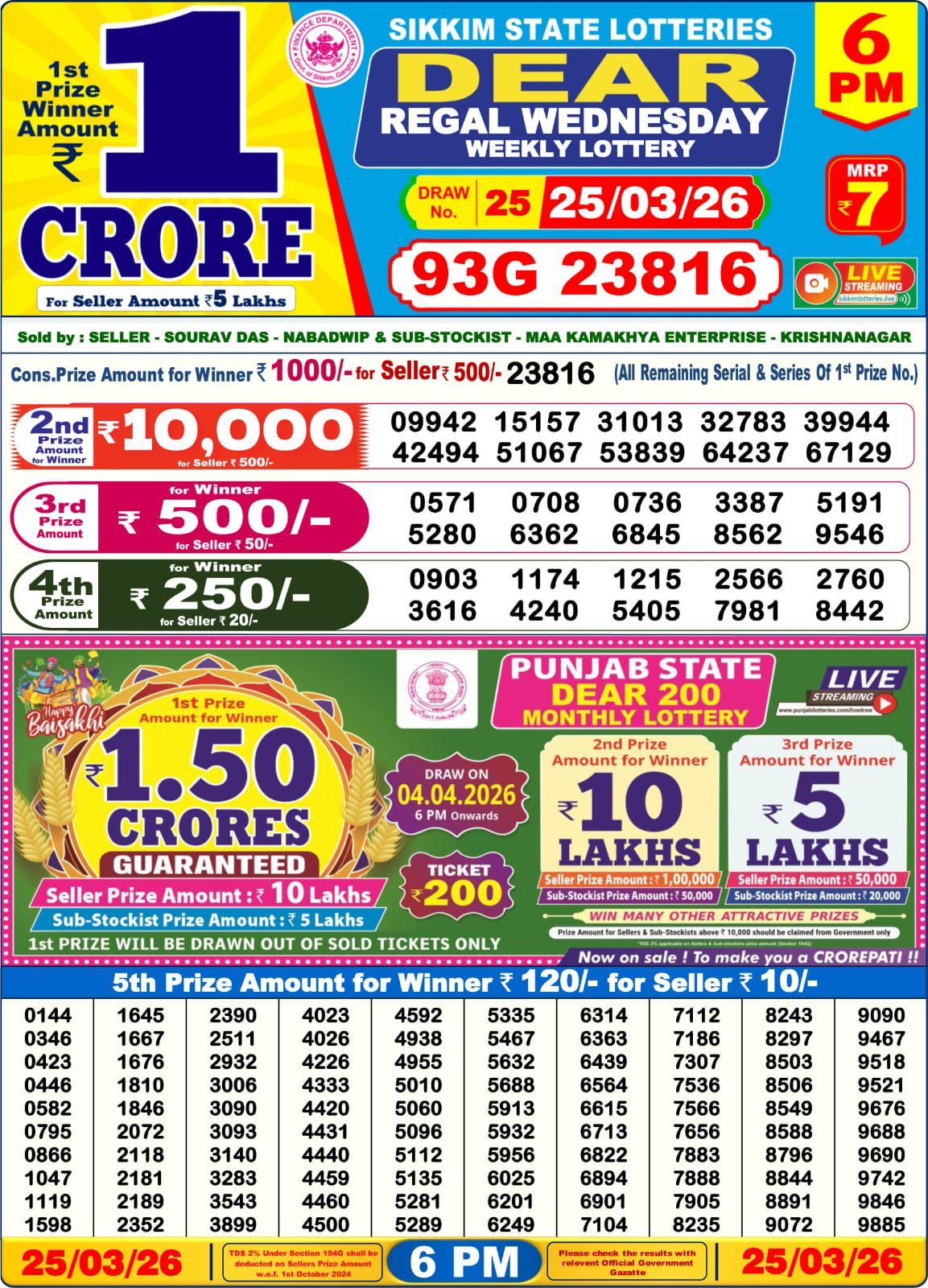 Status: Declared. 1st Prize (₹1 Crore) winning number: 93G23816#1PM86E29913.